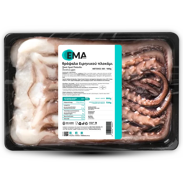 Θράψαλο Ειρηνικού (Dosidigus gigas) πλοκάμι (μαλάκιο) (79%), νερό (20%), [ρυθμιστής οξύτητας: (E330), (E-331), αλάτι].