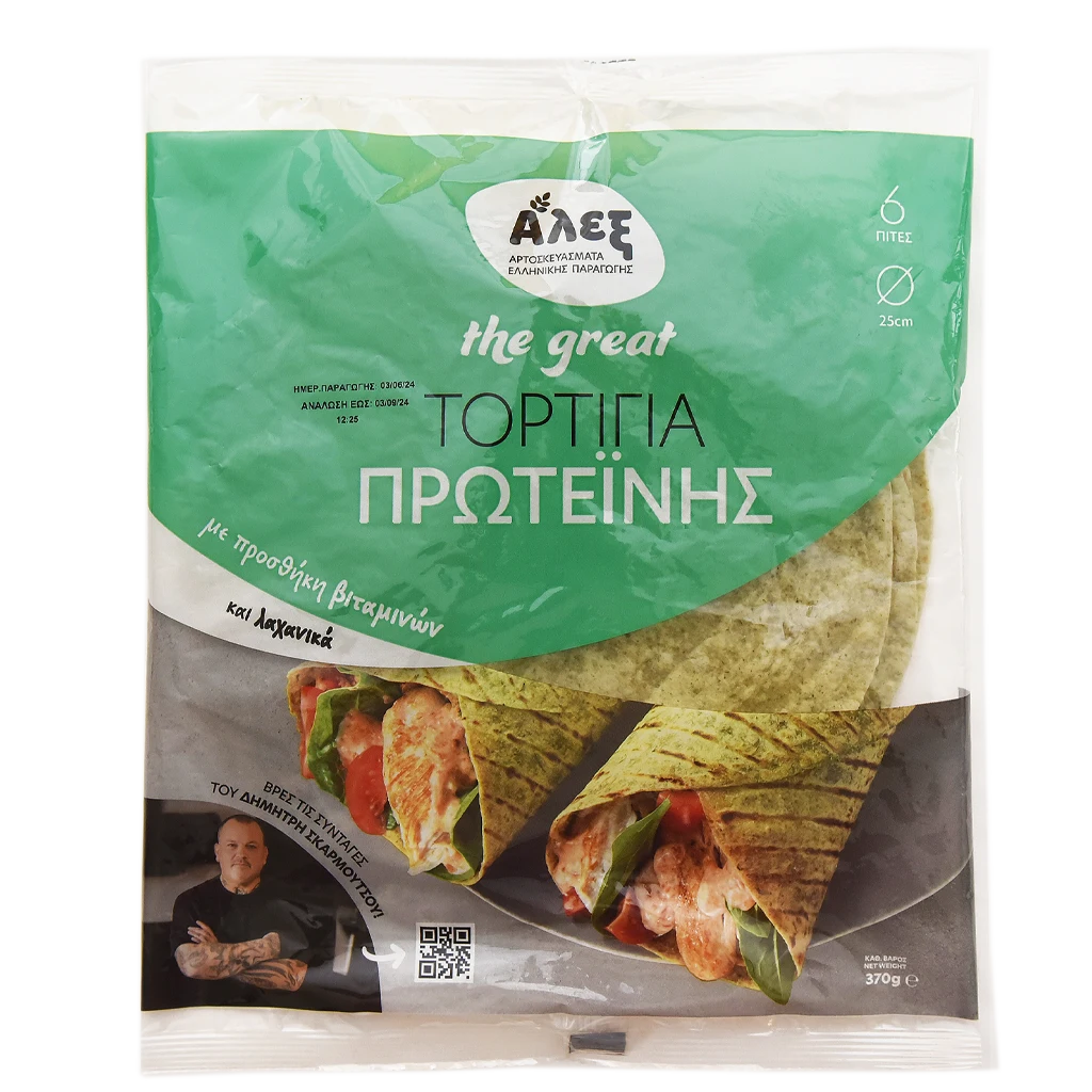 Μείγμα τορτίγιας [άλευρο σίτου (γλουτένη) 56%, γλουτένη σίτου, ζάχαρη, αλάτι, φυτικά λιπαρά (φοινικέλαιο), ρυθμιστές οξύτητας: κιτρικό οξύ & γλυκόνο-δ-λακτόνη, γλυκαντικό: σορβιτόλη, διογκωτικές ύλες: δισοξίνο πυροφωσφορικό νάτριο & όξινο ανθρακικό νάτριο, συντηρητικά: προπιονικό ασβέστιο & σορβικό κάλιο γαλακτωματοποιητές: μόνο-και διγλυκερίδια λιπαρών οξέων & νατριούχος στεατικός εστέρας του γαλακτικού οξέος, κυστείνη βιοτεχνολογικής προέλευσης, μπαχαρικά 4% (σπανάκι, κρεμμύδι, άνηθος, σκόρδο, πάπρικα, κύμινο, σπιρουλίνα, μαΐντανός, κόλιανδρος, μαύρο πιπέρι), ένζυμα].